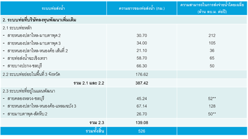 ตอบ: ระบบท่อส่งน้ำที่อยู่ภายใต้การบริหารของบริษัทฯเอง ในส่วนของระบบท่อหลักและระบบท่อย่อยในพื้นที่ 3 จังหวัด หากรวมกันแล้วจะอยู่ที่ 387.42 กม. และระบบท่อที่อยู่ในแผนพัฒนาอีก 139.08 ปัจจุบันบริษัทฯมีระบบท่อส่งน้ำทั้งหมดเป็น 526 กม. ดังตารางด้านล่าง